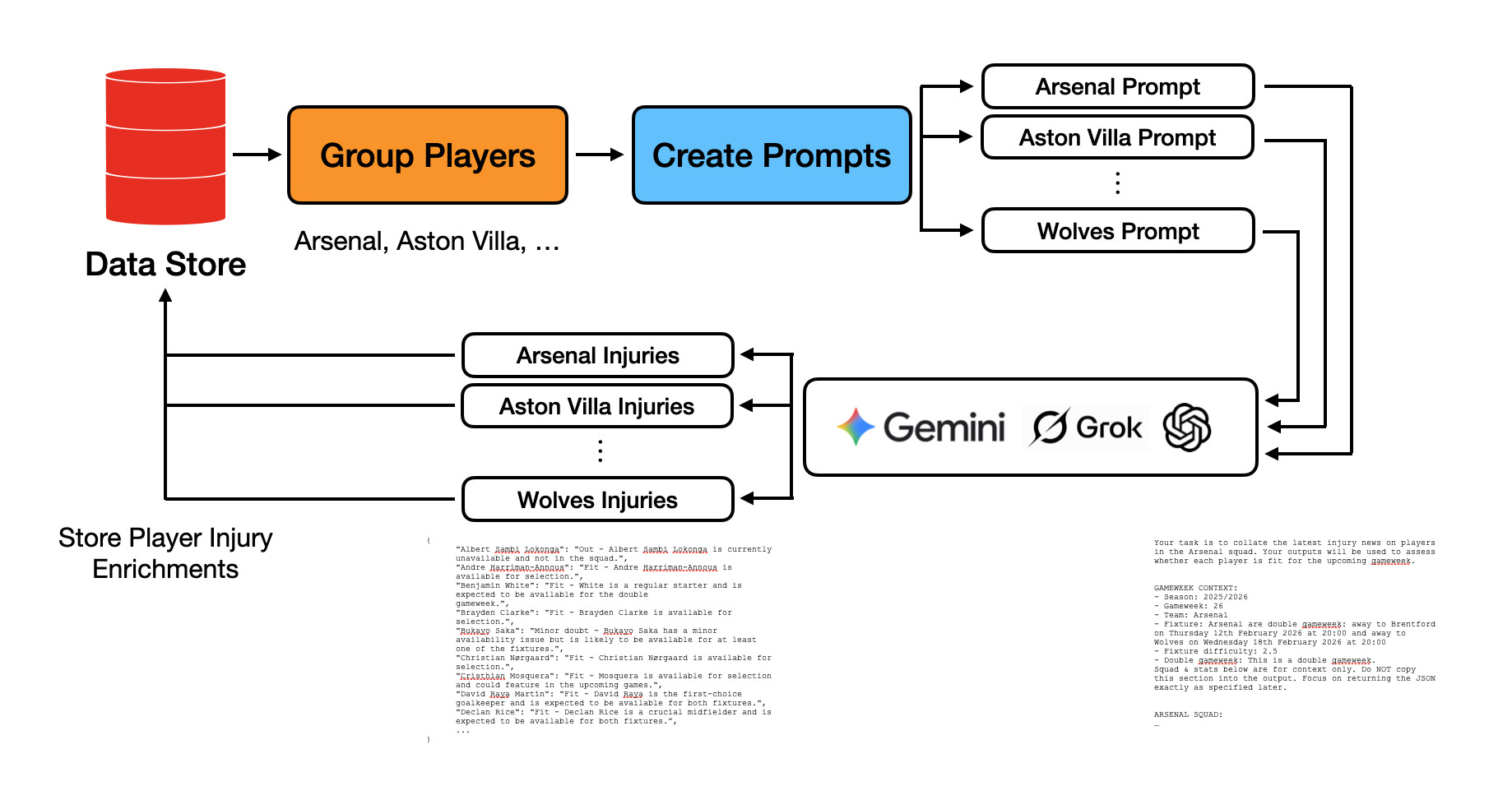 By doing it on a team by team basis I'm making a trade off. I could query each player individually - but with 600+ players in the game, that's 600+ prompts per gameweek. That's expensive and unnecessary. At the other extreme, I could stuff all players into a single giant prompt. But that's very unstable and a huge ask for the model, likely leading to hallucinations and missed players. Grouping by club is a sensible midpoint.