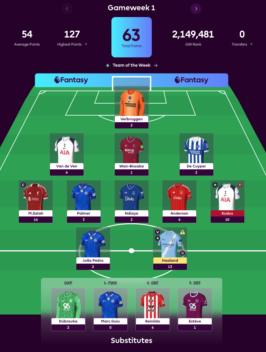 The rougher weeks - GW2, 12, and 13 (all 39 points) - weren't disastrous, but they were noticeable. GW2 was 12 points below the average player, while GW12 matched the average and GW13 was 4 points ahead. In these weeks, Haaland contributed only for playing minutes, no goals or assists, and several players - including Wan-Bissaka and De Cuyper - failed to score any points at all.