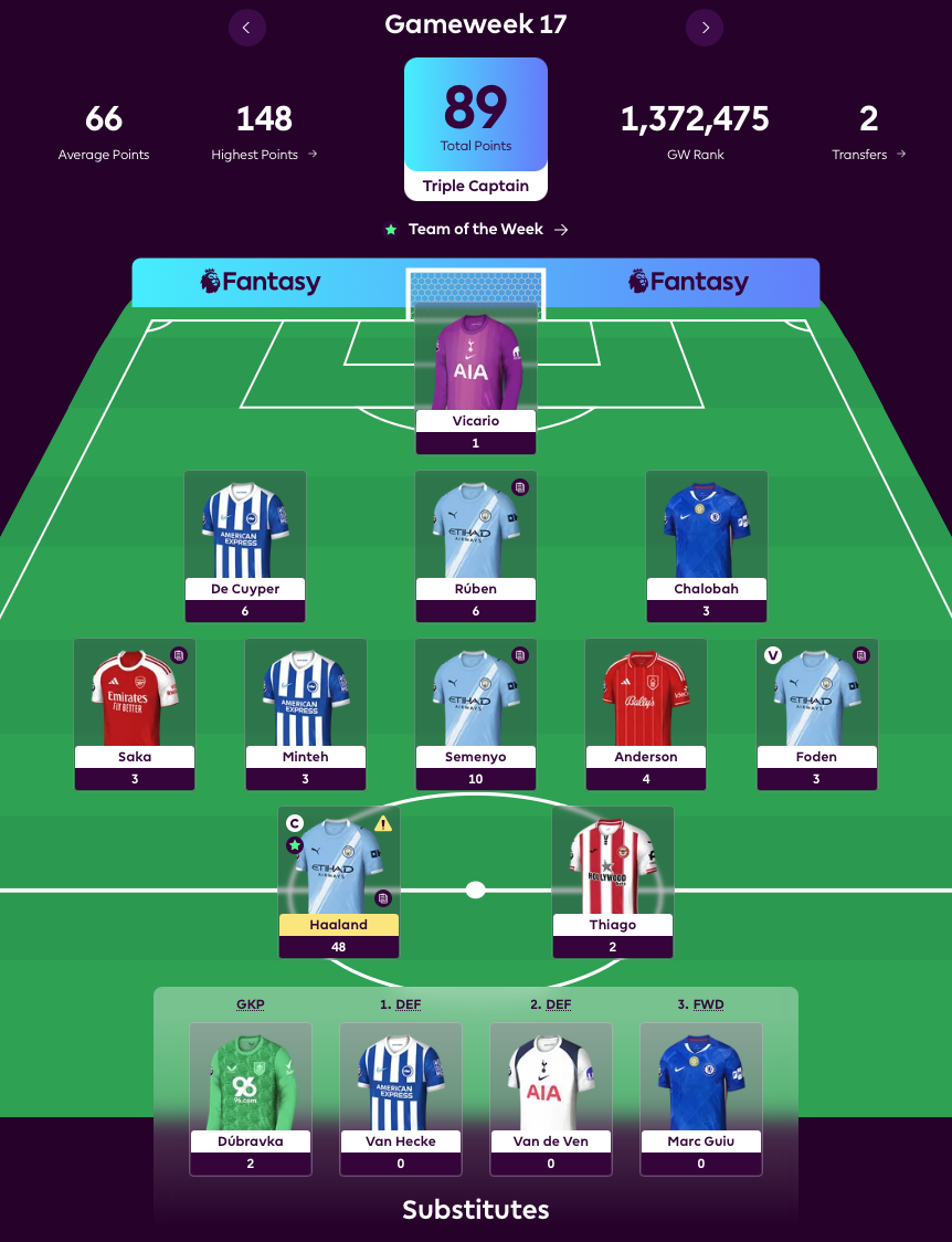 Its standout weeks, GW14 and 17, were what really pulled it clear of the pack, racking up 78 and 81 points respectively. Points were spread across the squad, but Haaland as captain stole the show with 28 and 32 points. GW14 also saw Muñoz chip in with 14 points, while GW17 rewarded a balanced ensemble: Hincapié, Semenyo, Reijnders, Mukiele and Truffert all netted 5+ points.