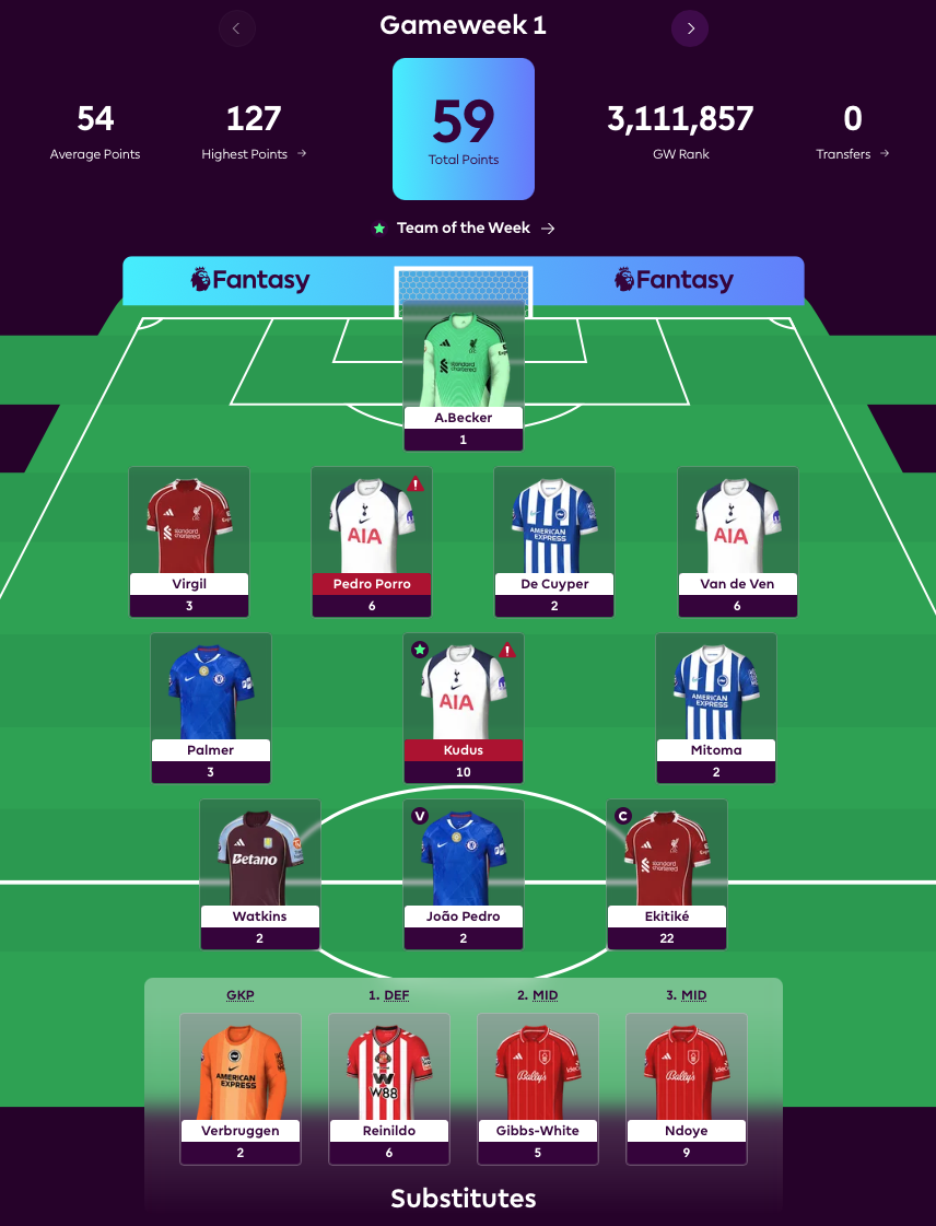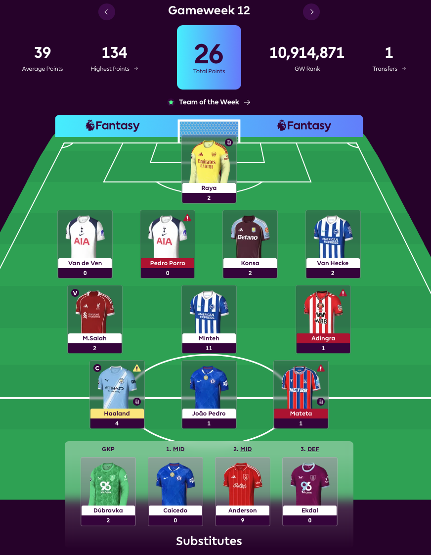 The lows were harsher. GW12 delivered a measly 26 points - 13 below the average player. Nearly half of that came from a single player, Minteh (11 points). The rest was a mess: two players scored zero, three scored one point and four scored just two points. Included were two Spurs defenders facing Arsenal, who lost 4-1. Grok acknowledged the tough fixture, but the temptation of attacking returns proved too great.